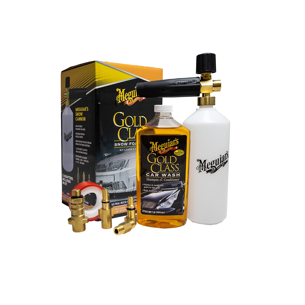 Meguiar’s froðubyssu sett. Kemur með tengjum fyrir flestar Karcher, Bosch og Nilfisk háþrýstidælur ásamt Meguiar’s Gold Class bílasápu.