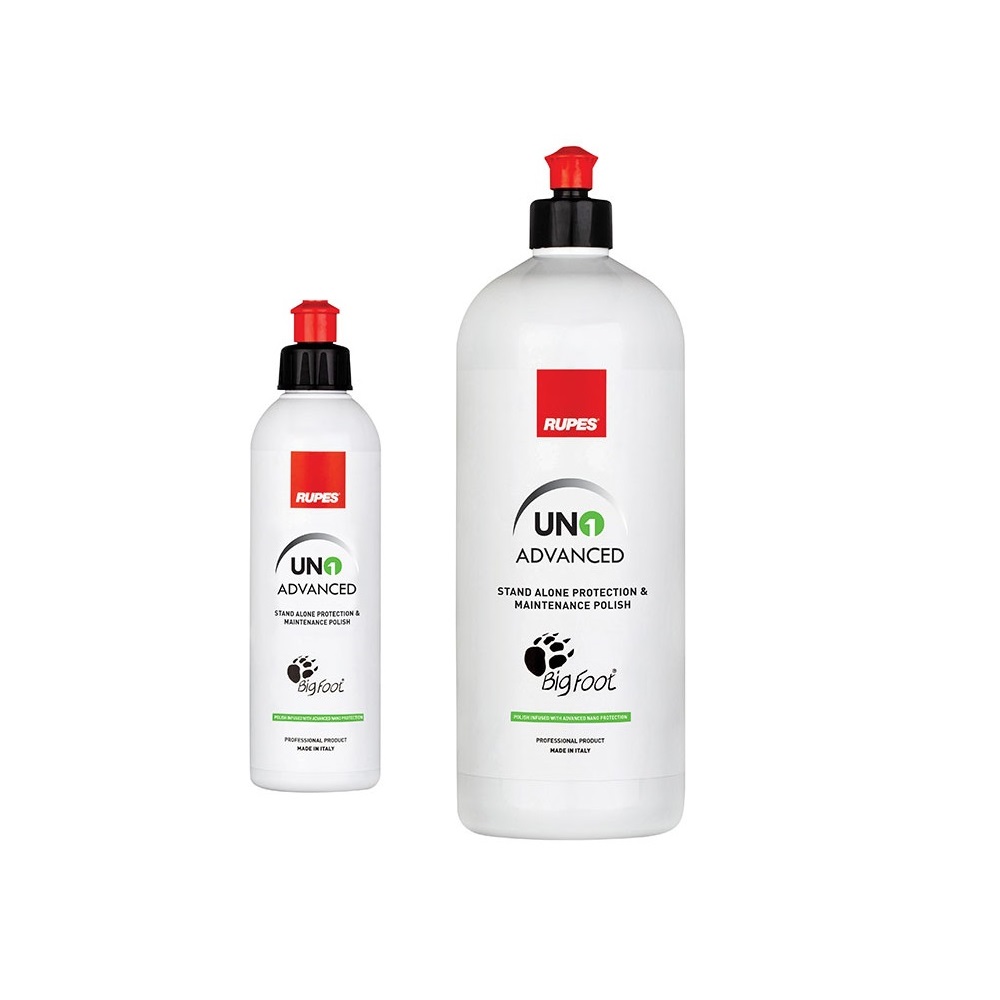 Formúlan að UNO ADVANCED sem er þróuð, blönduð og pökkuð að fullu hjá RUPES samanstendur af háþróaðri blöndu af fínum massa og hágæða nano vörn sem veitir margra mánaða endingu. UNO ADVANCED er hægt að nota einan og sér fyrir létta mössun, auka gljáa, veita langvarandi vörn fyrir lakkið eða sem lokaskref í grófri mössun. Eftir að hafa farið yfir lakkið með UNO ADVANCED verður sjáanlegur munur á glans og „mýkt“ í lakkinu. Massinn hentar með öllum gerðum af massavélum og hentar á allar gerðir lakks (að möttu undanskildu), gelcoat, dufthúðun, ál ofl. Eftir að búið er að vinna lakkið með UNO ADVANCED þarf að halda bílnum þurrum í 4 tíma til að forðast blettamyndun.