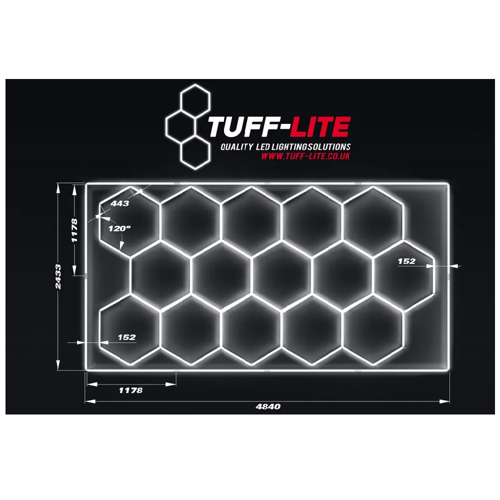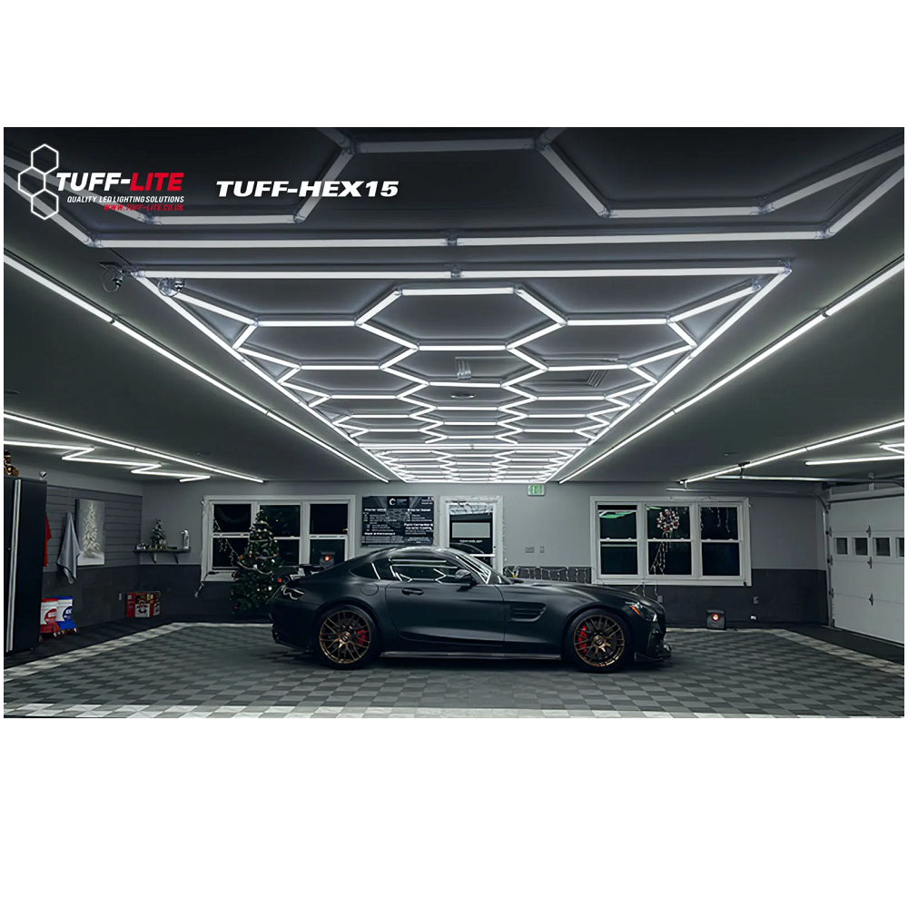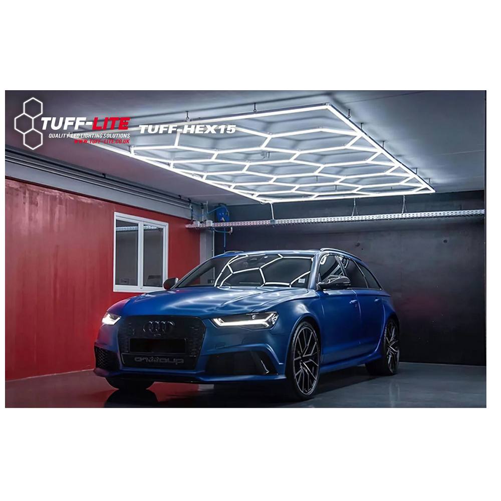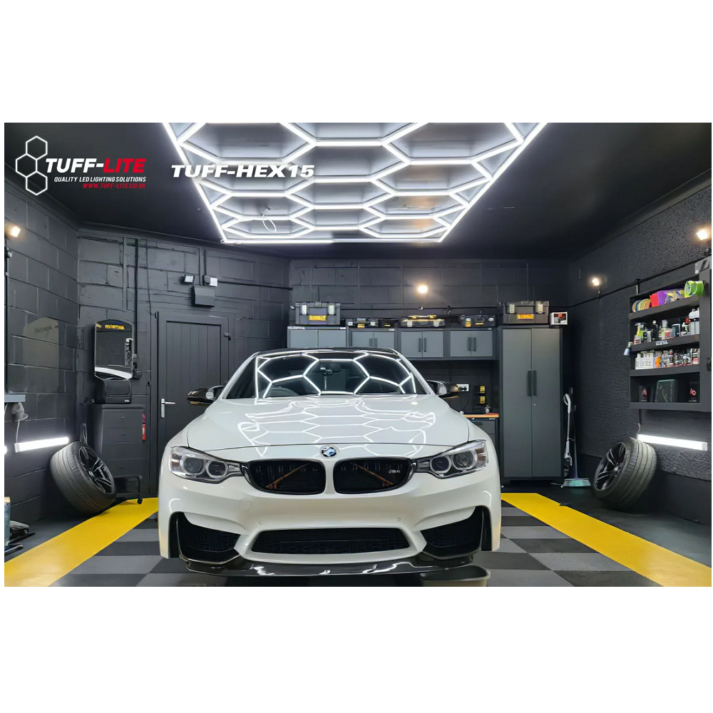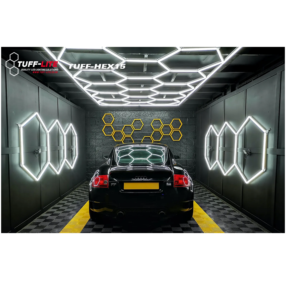 Loksins er fáanleg alvöru lýsing í bílskúrinn, bónstöðina eða sýningarrýmið. Pakkinn samanstendur af 15 hexagon LED ljósum sem falla inn í einfaldann LED ramma. Vertu með alvöru lýsingu í rýminu þínu og ekki skemmir fyrir að þetta snaaar lúkkar. Stærð rammans er 4,84m x 2,43m.