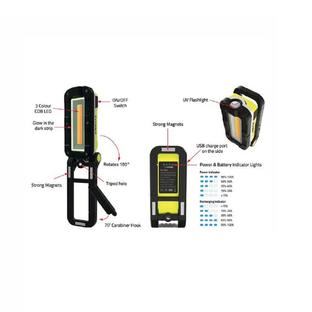 CRI-700R er öflugt vinnuljós með CRI 96+ COB LED ljós. Það er fullkomið til notkunar sem detail- og litaljós með þremur litatilbrigðum stillingar 2700K / 4500K / 6500K sem hentar fyrir bílaviðgerðir, bílamálun, slípun eða detail. Auka 395nm UV ljósageislin gerir auðveldara að finna vökva, leka, ryk, bletti og fleira. Umgjörð sem er úr copolymer og áli tryggir bæði endingu og styrkleika sem og að það er vatnsvarið samkvæmt IPX5 staðli. Samanbrjótanlegur standur sem hægt er að snúa í 180° er einnig með hentugum upphengikrók og sterkum segli sem og festingu fyrir þrífót. CRI-700R er með öfluga 5200mAh lithium-ion rafhlöðu sem er með hraðhleðslu USB-C snúru og endurskinsborða í kringum LED ljósið sem eykur sjáanleika.